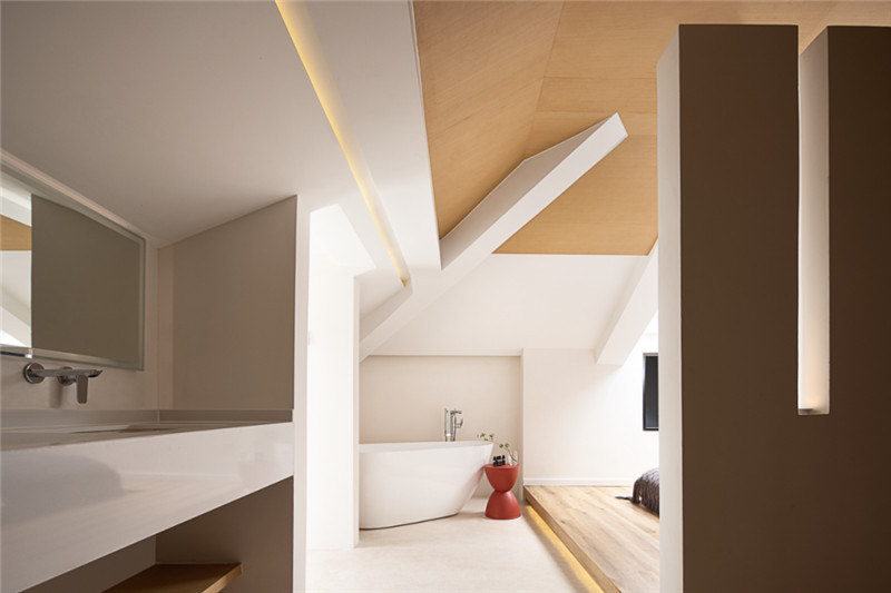 極具雕塑感的樓梯口讓空間內(nèi)的藝術(shù)性進(jìn)一步提升,把太湖石與湖水置入空間中形成一片微型景觀,仿若置身于美景之中。在與當(dāng)?shù)氐牡孛才c景觀的關(guān)系上,設(shè)計(jì)師匠心獨(dú)運(yùn),通過設(shè)計(jì)來呈現(xiàn)建筑與自然的關(guān)系。