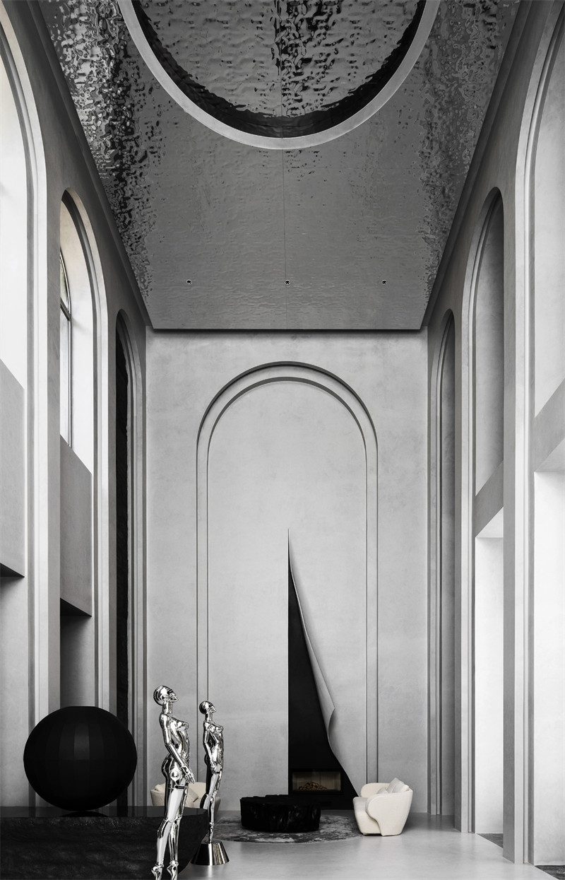 挑空大廳設(shè)計(jì)以拱形為符號(hào)元素,建立陣列的具有古典比例韻律與審美經(jīng)驗(yàn)的視覺語(yǔ)言。石材雕刻而成的多功能條形桌與球形電子科技顯示屏結(jié)合,兩側(cè)對(duì)稱陳列的機(jī)器雕塑,似乎仰望著“蒼穹”——海水漫延于天空,倒映著一切的物質(zhì)形態(tài)。